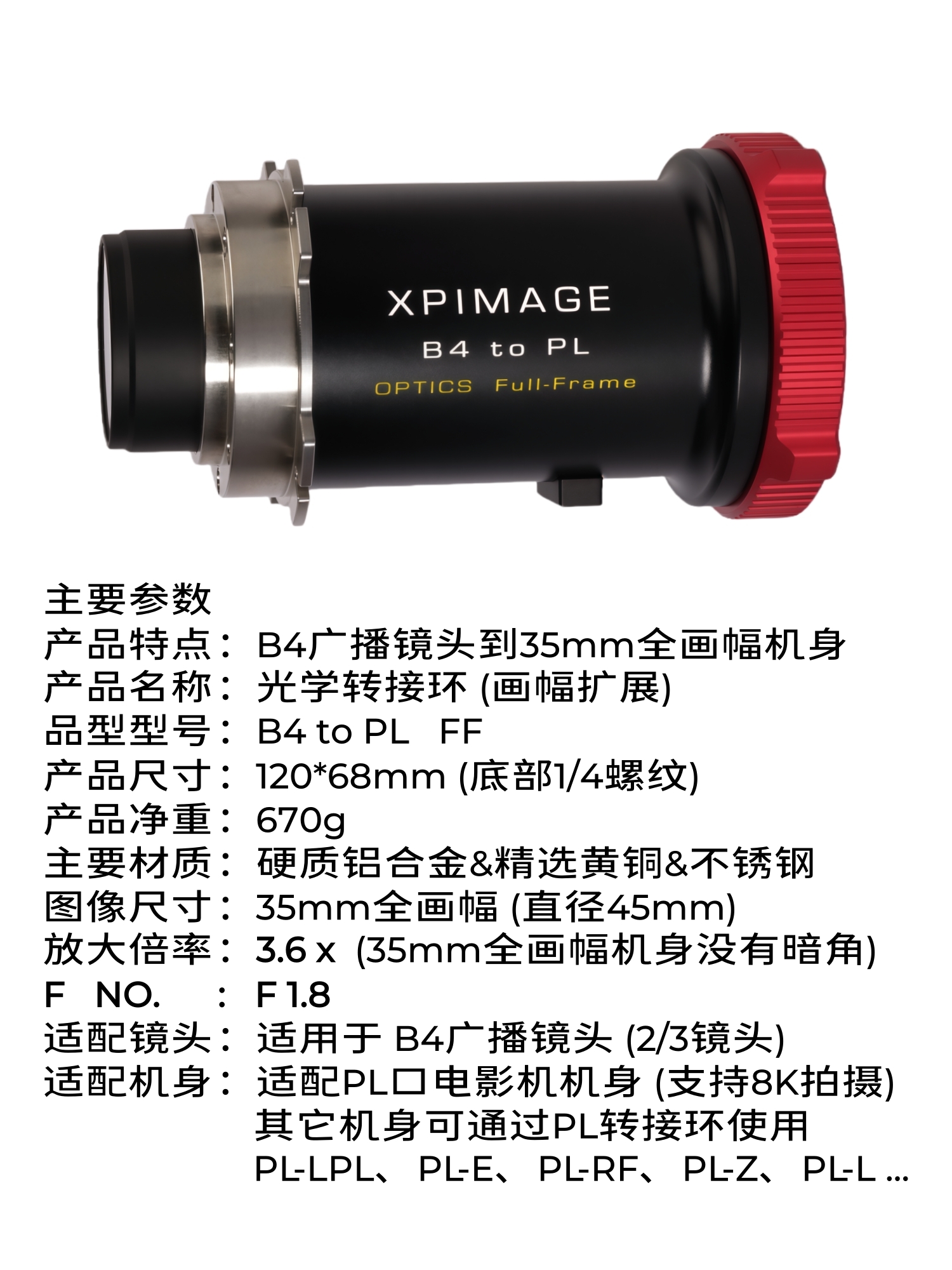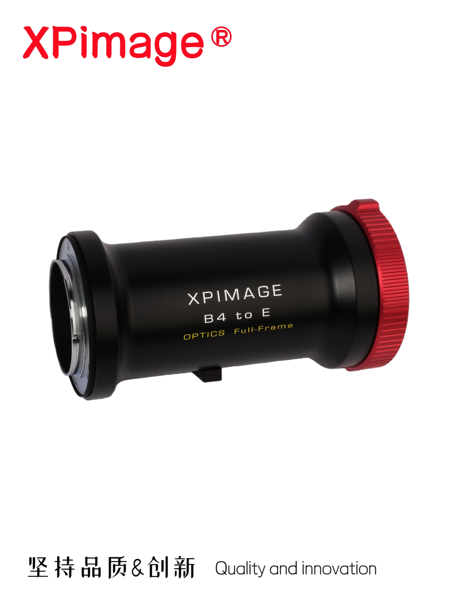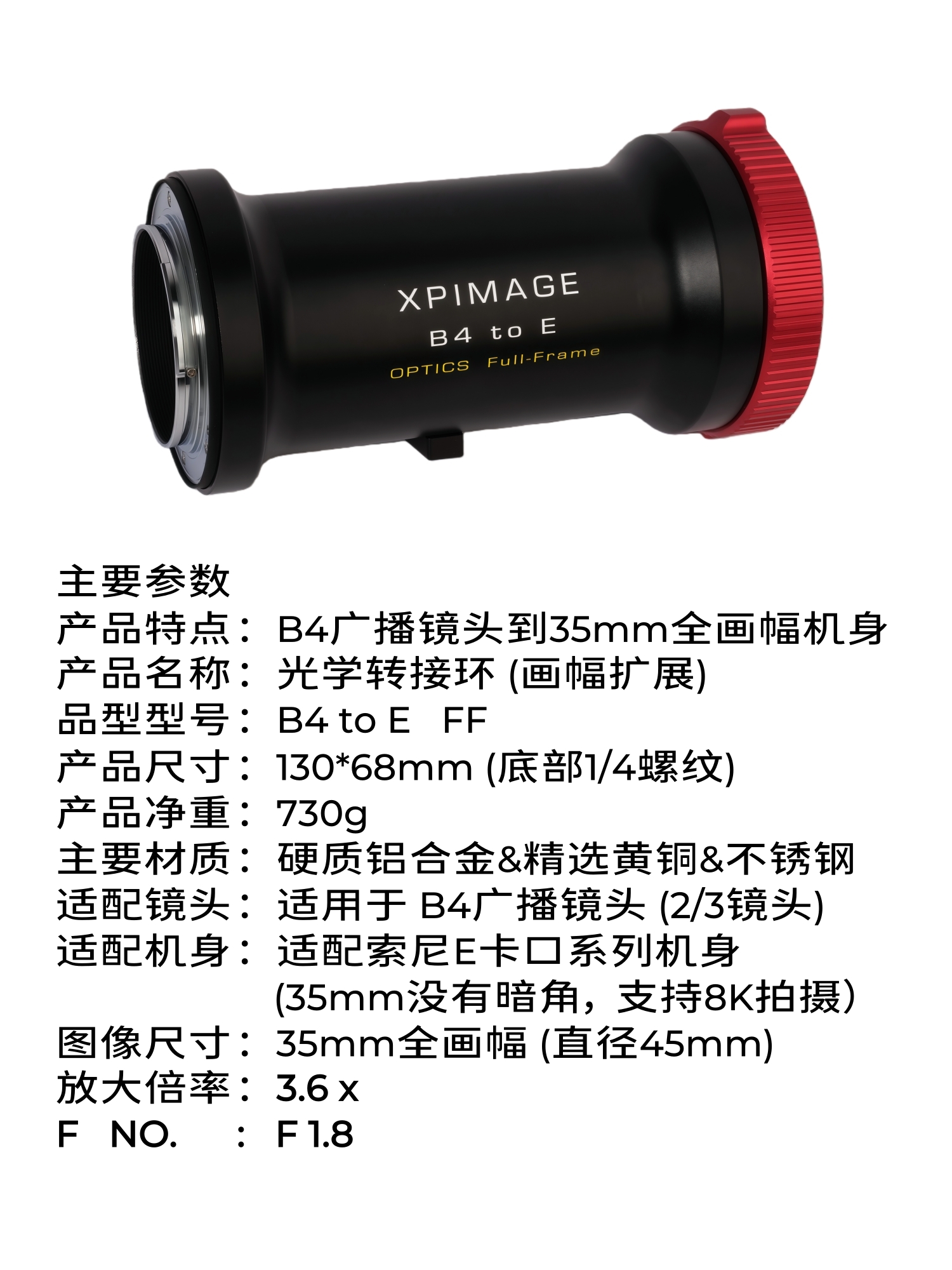 XPIMAGE 发布 B4转全画幅机身转接环,搭配PL口,索尼E卡口、佳能RF口、佳能EF口。优化镜头紫边,多机位拍摄,演唱会,会议,大型活动等。让广播级变焦镜头得以35mm全画幅电影机多机位拍摄使用。图像放大3.6倍,覆盖像场45mm,适配全画幅电影机。最大进光量达到F1.8,兼容市场上的2/3″ B4镜头。包含8组14片高折射率、低色散光学玻璃,最大限度保证对比度还原传输和最小的像差,得到最高的光学品质。